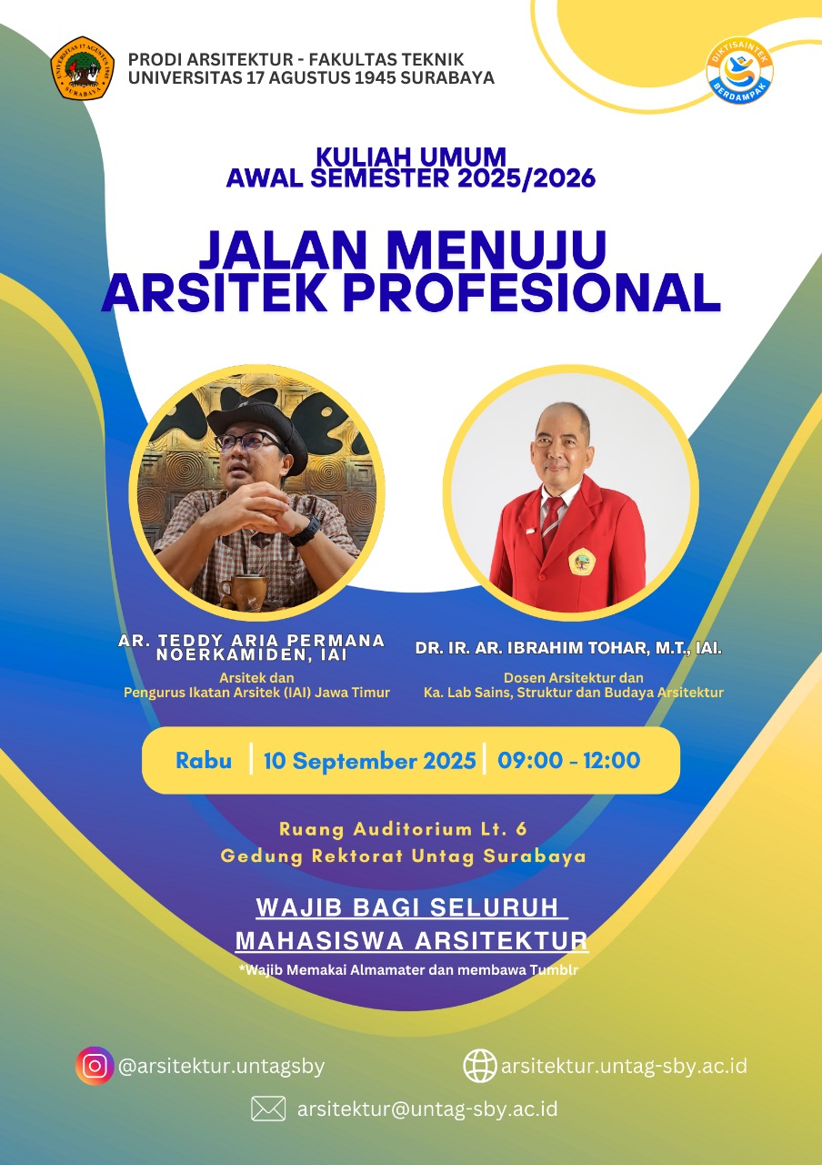 Sehubungan dengan agenda Kuliah Umum Awal Semester Gasal 2025/2026 dengan tema “Jalan Menuju Arsitek Profesional”, bersama ini kami sampaikan informasi pelaksanaan kegiatan sebagai berikut: